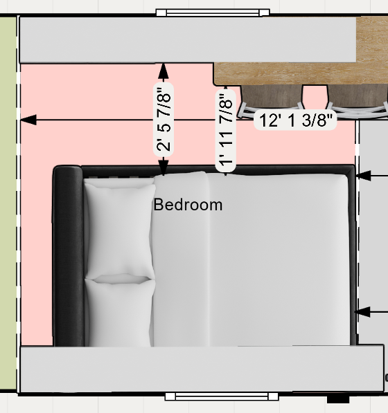 According to the current 3D and 2D layout views, the bedroom includes: